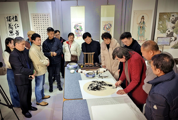 现场演示指画技法揭牌仪式后,与会嘉宾参观了“林栩大师工作室”。林栩与他的三位弟子林一雷、易树生、刘成明现场演示了指画技法。只见师徒四人配合默契,或用掌或用指,短短十来分钟,一幅“峨眉山之巅”指墨山水图跃然纸上,气势磅礴,让嘉宾们感受到了非遗的无穷魅力。