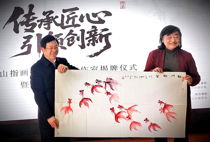 赠送指画作品揭牌仪式上,赵晓鸿还为林栩颁发了四川省旅游书画院副院长聘书,林栩为学校赠送了一幅他新创作的指画作品“十二金鱼图”,并举行了拜师仪式。三位学生代表向林栩呈递了“拜师贴”,林栩回赠了“回师贴”。